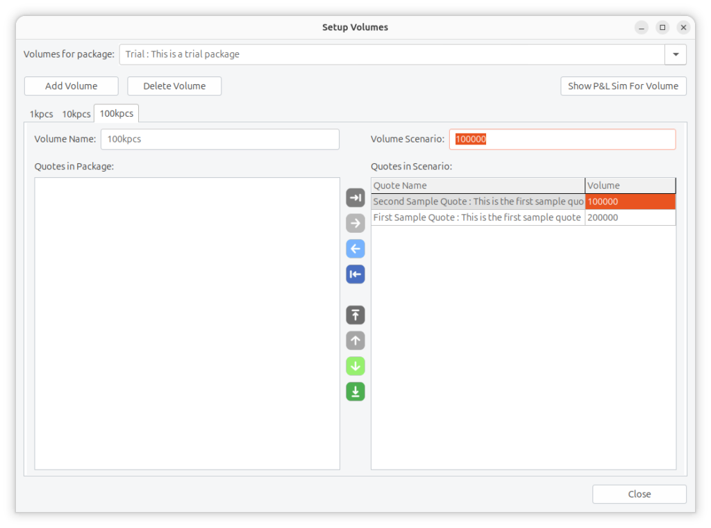 A volumen szerkesztő felület, ahol egy adott ajánlat csomag elemeihez rendelhetünk volumen értékeket és ezeket egy kalkulációban egyesíthetünk a P&L szimulációkhoz.